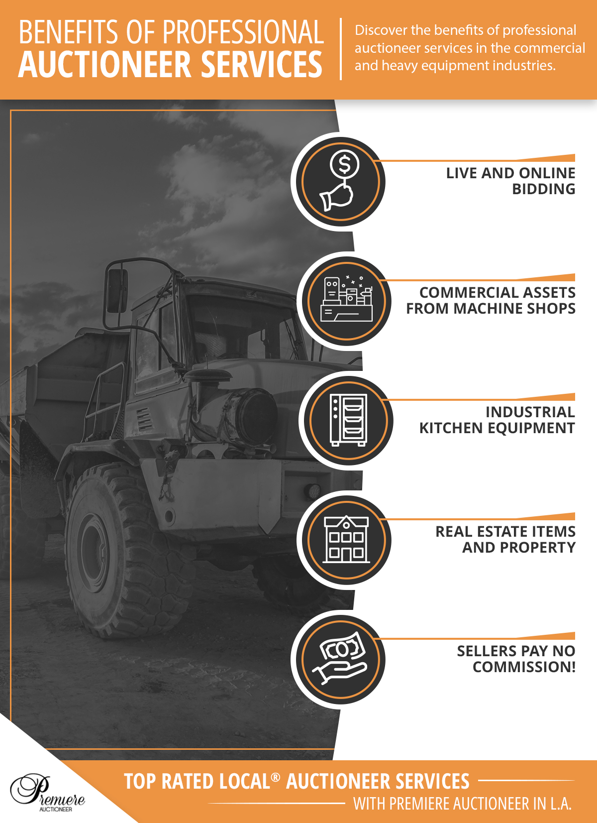 Premiere Auctioneer is proud to be your Top Rated Local® auctioneers in Inglewood. From heavy equipment and commercial assets to real estate property and more, we’re here to help you find and get the deals you want. Whether you’re interested in placing items up for auction or looking for our next real estate auction, please contact our team for the information you need.